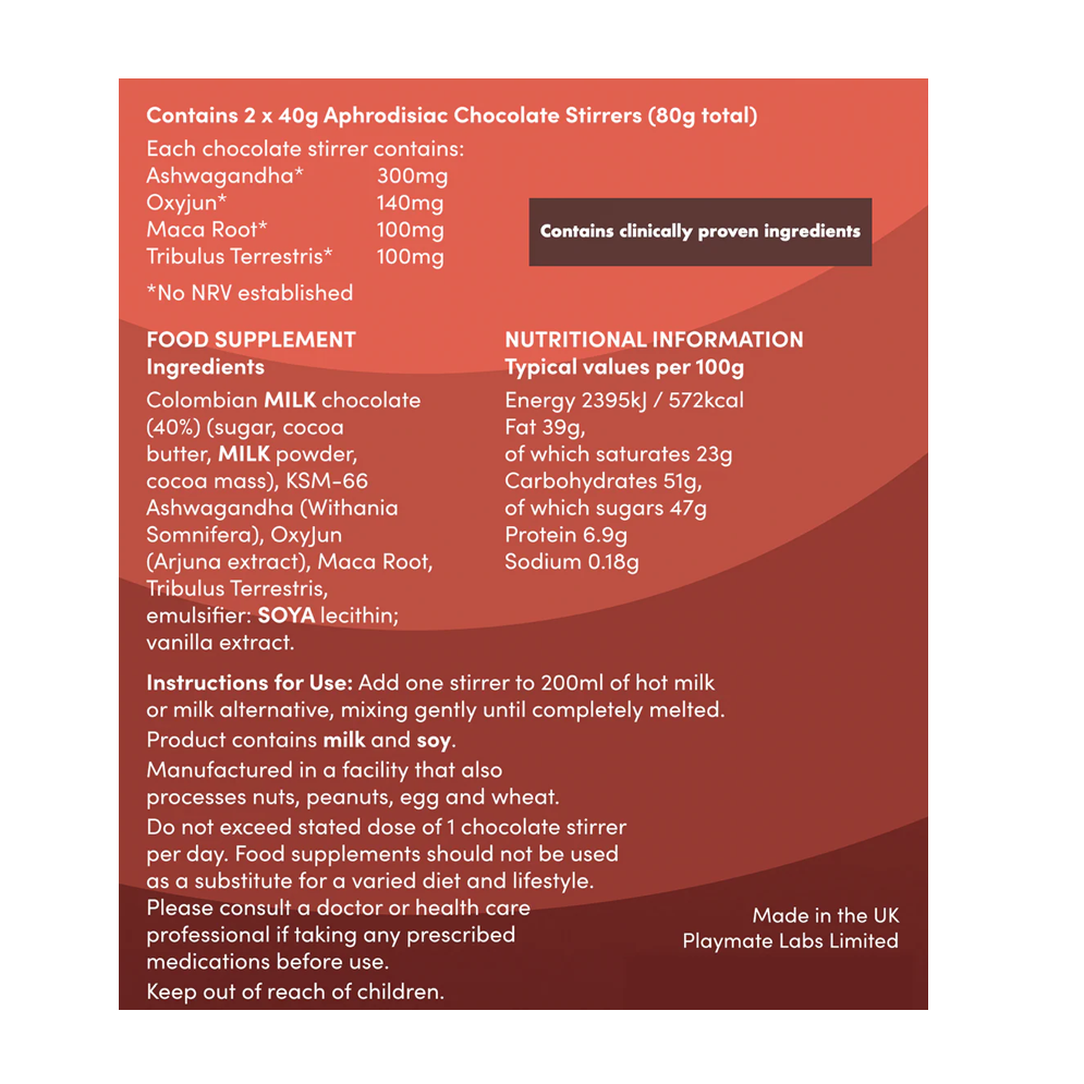 Each chocolate stirrer contains 300mg Ashwagandha, 140mg Arjuna Extract, 100mg Maca Root and 100mg Tribulus terrestris.