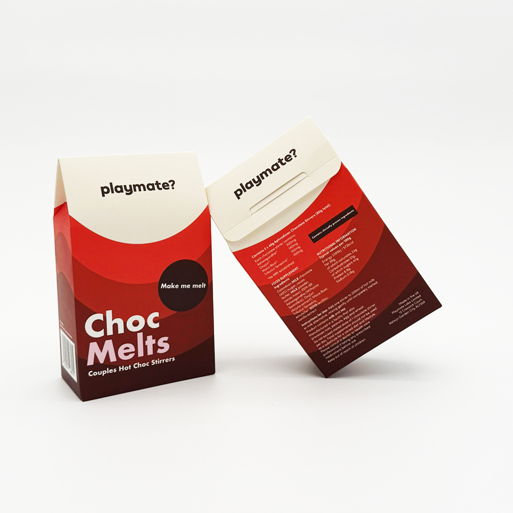 Each box contains 2 delectable melts made with 40% Colombian chocolate and aphrodisiac ingredients. Plant botanicals such as KSM-66 Ashwagandha, Tribulus, and Maca Root enhance libido and desire, relax the mind and body, and improve physical performance.