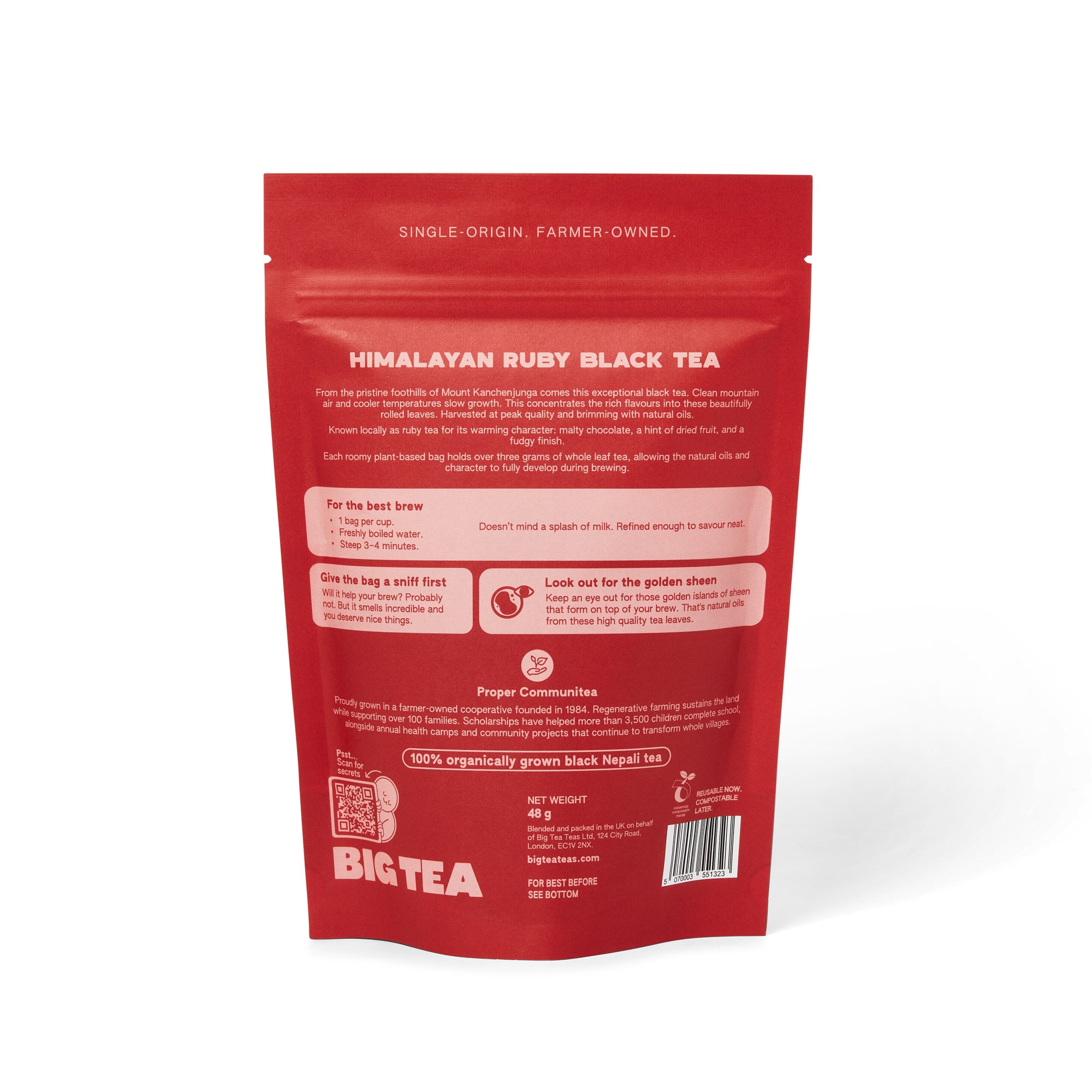 Discover this exceptional Nepali black tea, cultivated in the cool mountain foothills of sacred Mount Kanchenjunga, where slower growth concentrates remarkable depth of flavour in each leaf. Called "ruby" for its glowing red-brown brew and the rich warmth it brings, this tea comes from a cooperative established in 1984 that has transformed communities by supporting over 100 families, educating 3,500+ children, and protecting half their land as forest. Each cup delivers malty chocolate notes followed by dried fruit complexity, with a smooth, naturally sweet finish that lingers beautifully. Bold yet approachable, this is a breakfast tea with genuine character and purpose behind every leaf. Over three grams of large-cut herbs fill every plastic-free, biodegradable tea bag, delivering a robust infusion that doesn't compromise on taste.