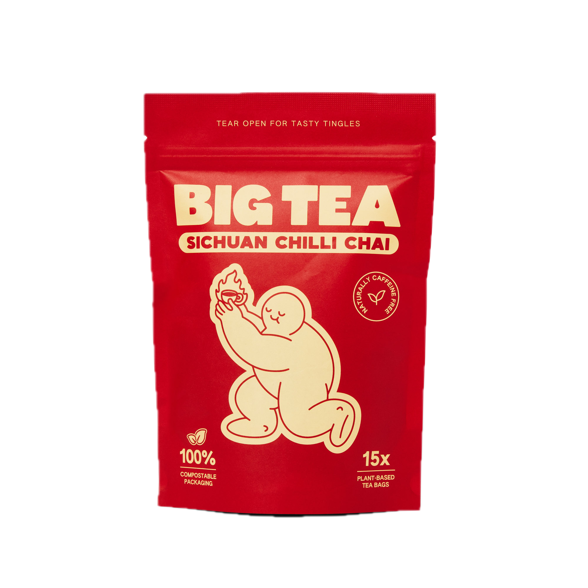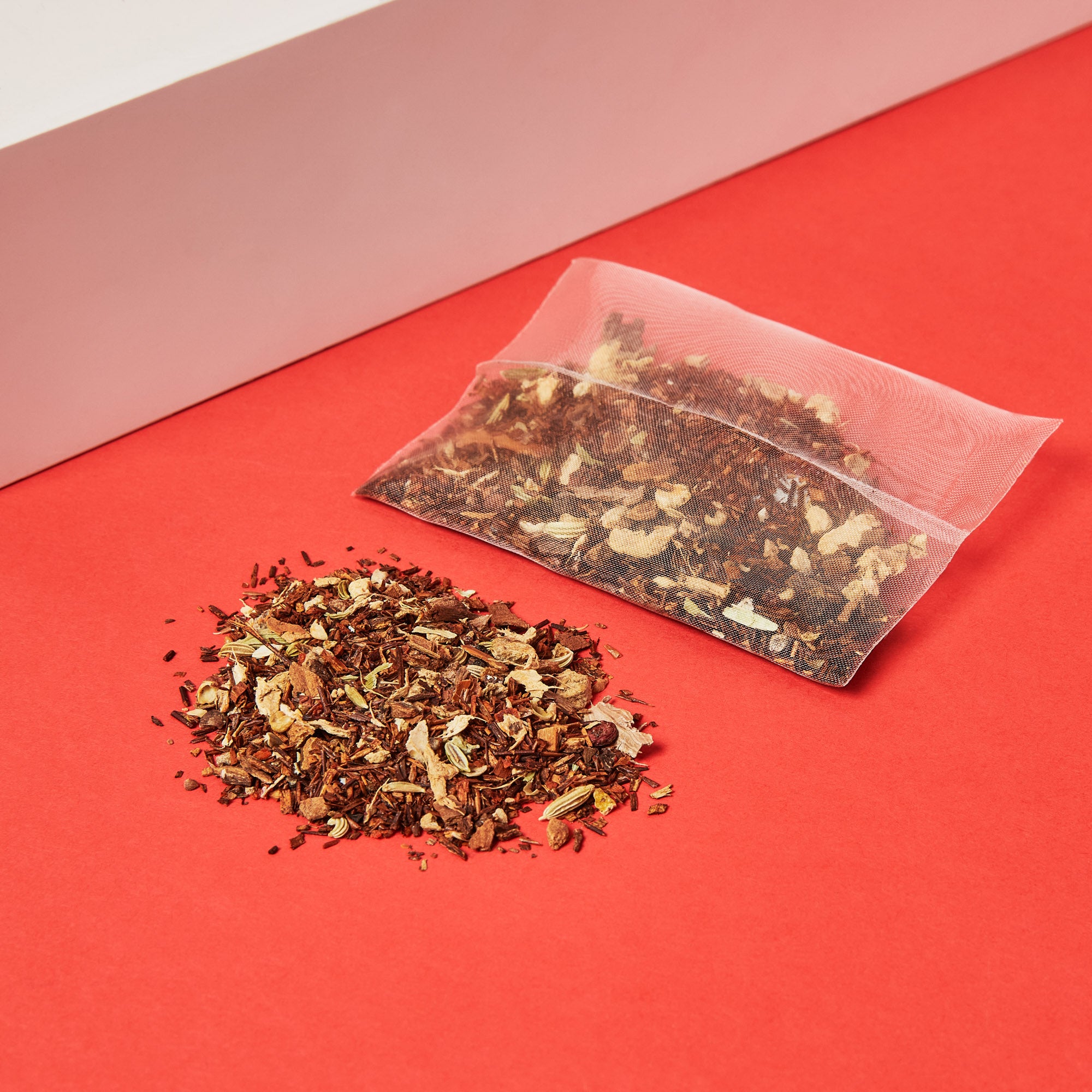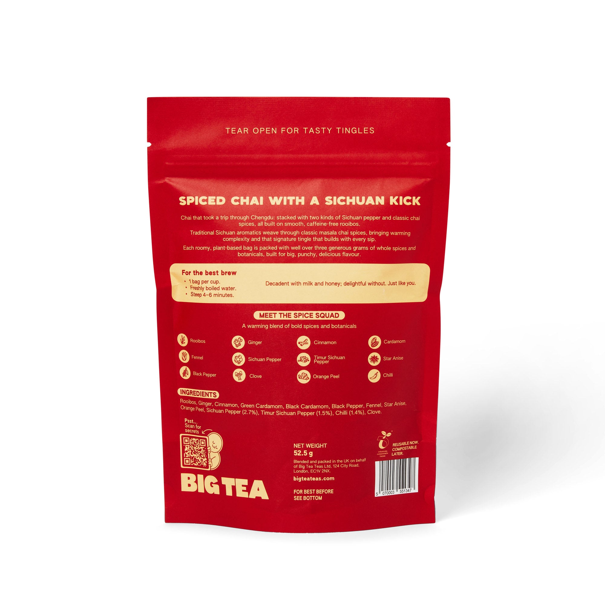 Experience a chai that defies convention. Inspired by Chengdu's bold flavours, this caffeine-free blend combines the comforting embrace of traditional masala spices, like Ginger, Cardamom, Star Anise, Clove, and Cinnamon, with the electrifying ma la tingling sensation from Sichuan and Himalayan Timur peppers. Built on a smooth rooibos base, with floral and citrusy notes from Sichuan and Orange Peel, this blend is a complex journey that unfolds with every sip. Thirteen carefully chosen botanicals deliver depth and richness, culminating in a numbing-spicy tingle that keeps you coming back for more. Over three grams of large-cut herbs fill every plastic-free, biodegradable tea bag, delivering a robust infusion that doesn't compromise on taste.