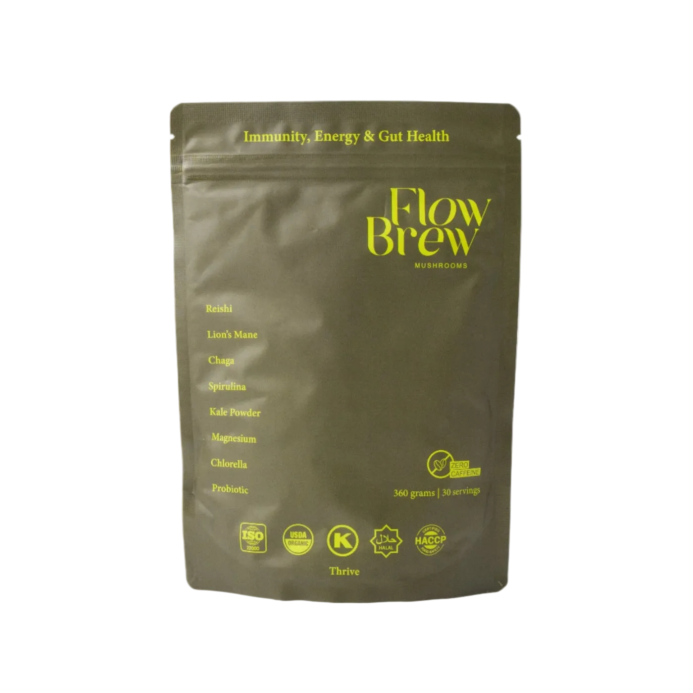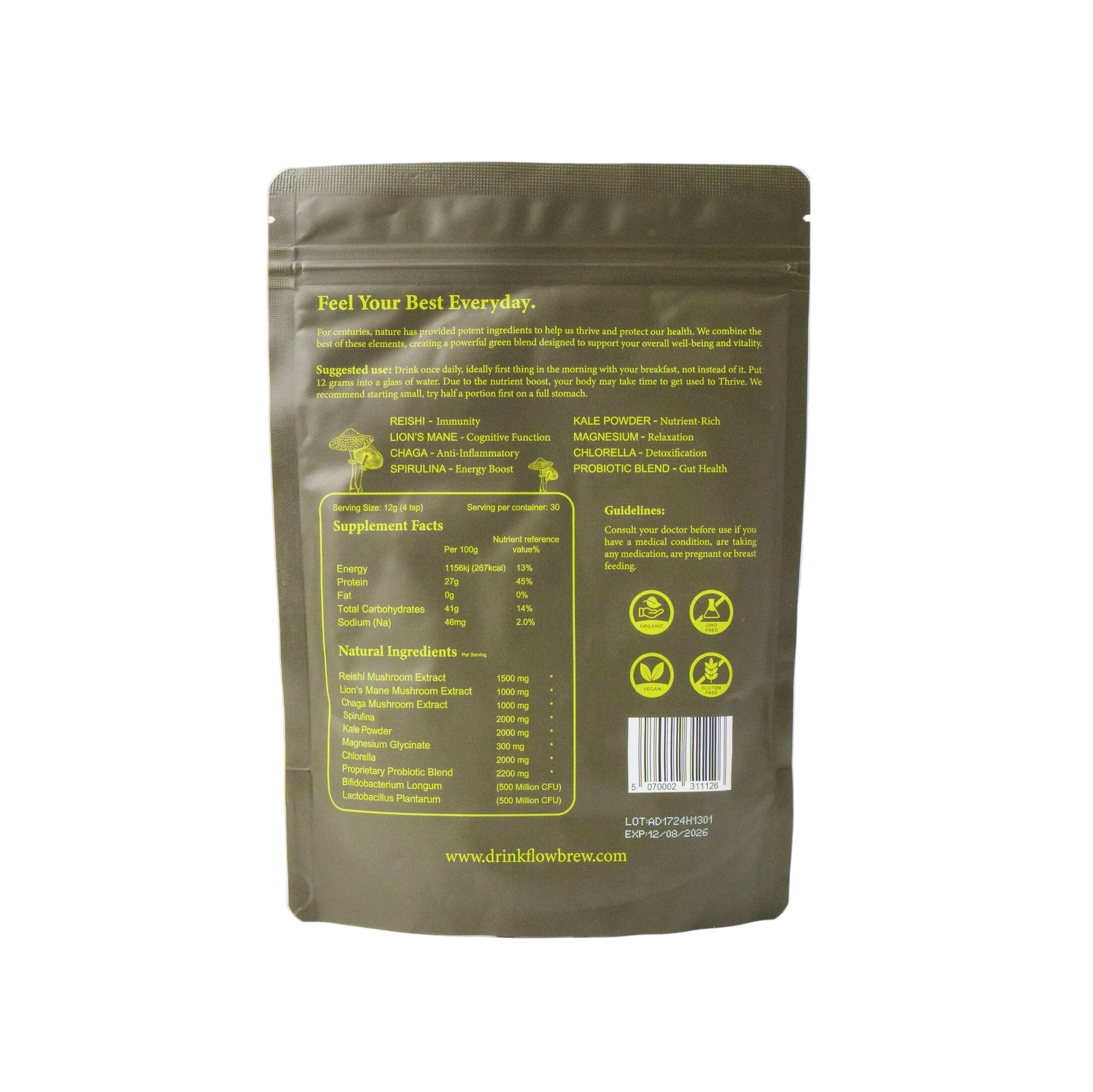 Thrive Greens Blend helps enhance energy, focus, immunity, and detoxification with a combination of organic mushrooms, minerals, super greens and probiotics. This potent mix includes Reishi, Lion’s Mane, Chaga, Spirulina, Kale, Chlorella, and Magnesium, each selected for their scientifically supported benefits. Thrive offers natural cognitive clarity and sustained energy through Lion’s Mane, Cordyceps, and Reishi; immune system reinforcement from Chaga and Reishi; and digestive and detox support via nutrient-rich super greens and probiotics. Third-party tested and gluten-free and vegan, this blend supports comprehensive daily wellness.