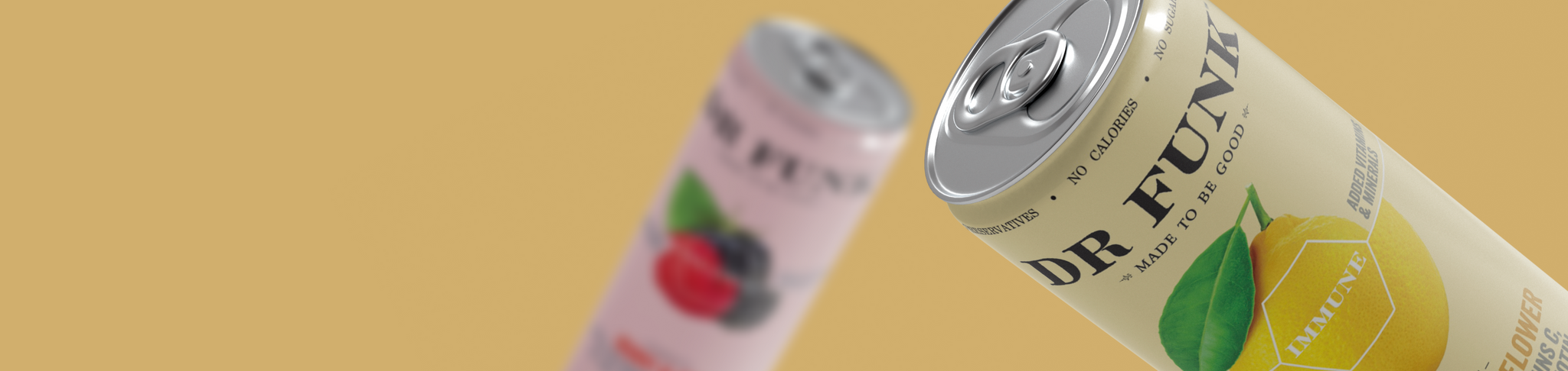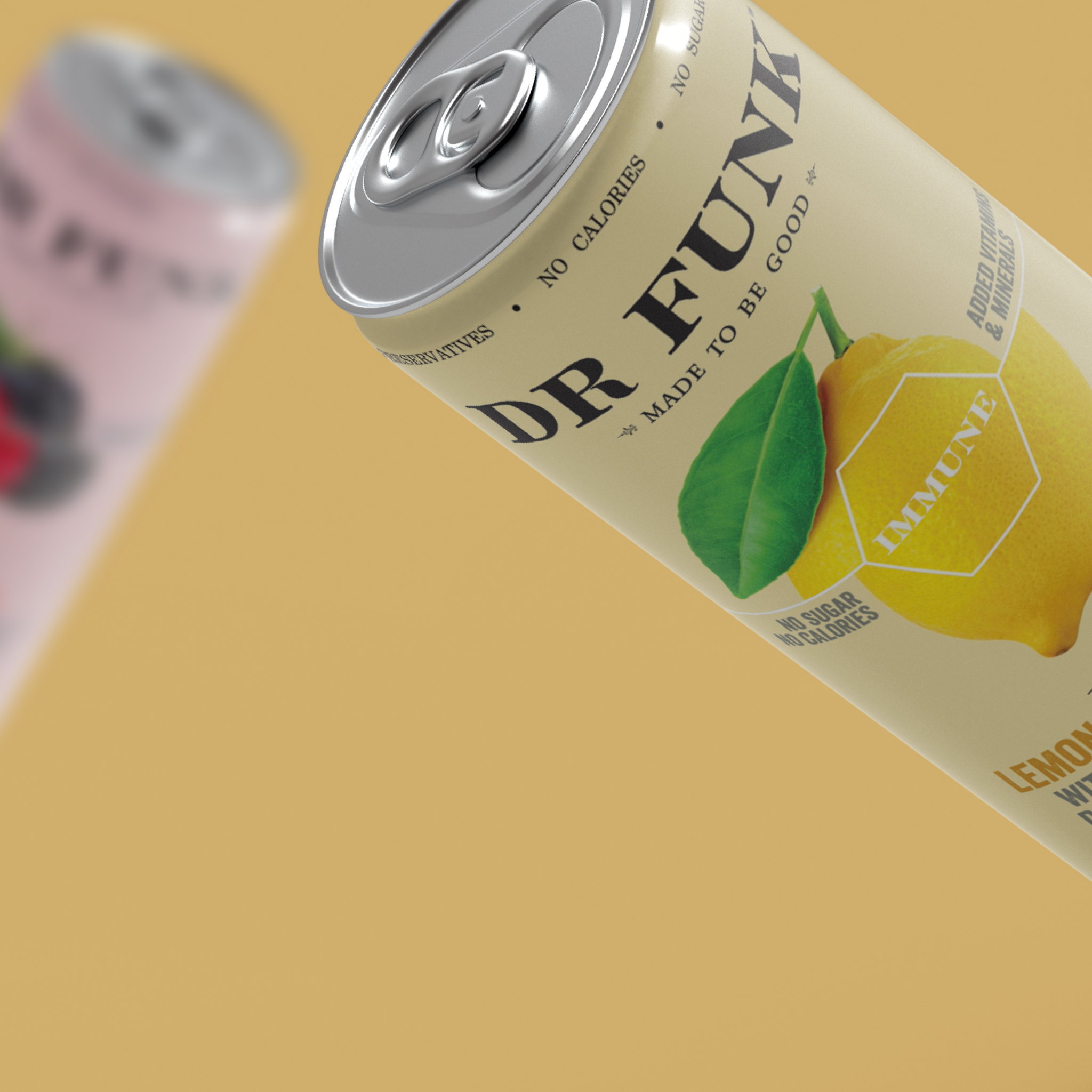 Dr Funk is an alternative to sugary soft drinks, featuring sparkling water, natural fruit and botanical flavours, vitamins and minerals. Every can is boosted with seven essential nutrients: 50% of the daily recommended Vitamin C, B6, B12, D3, Niacin, and Biotin, plus added Zinc, Magnesium, Selenium, or Calcium, depending on the flavour.