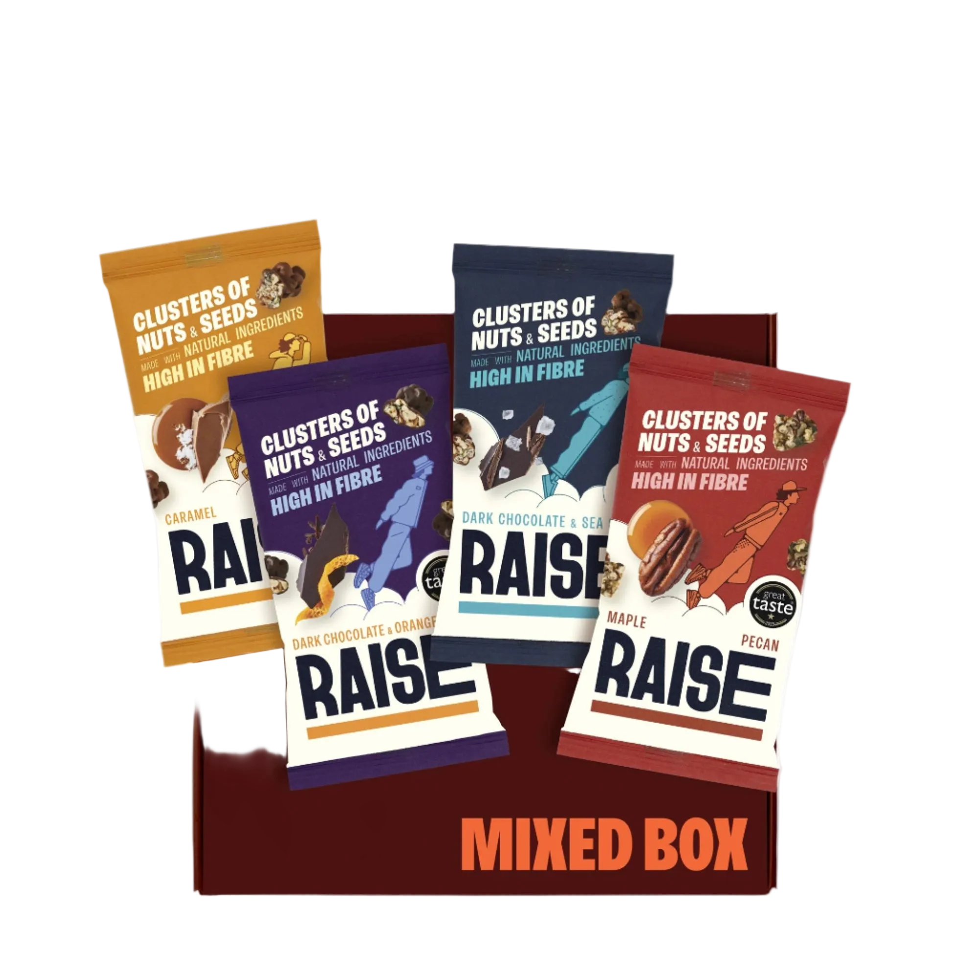 This box of mixed flavours includes Maple Pecan, Dark Chocolate & Orange, Caramel Sea Salt, and Dark Chocolate & Sea Salt.