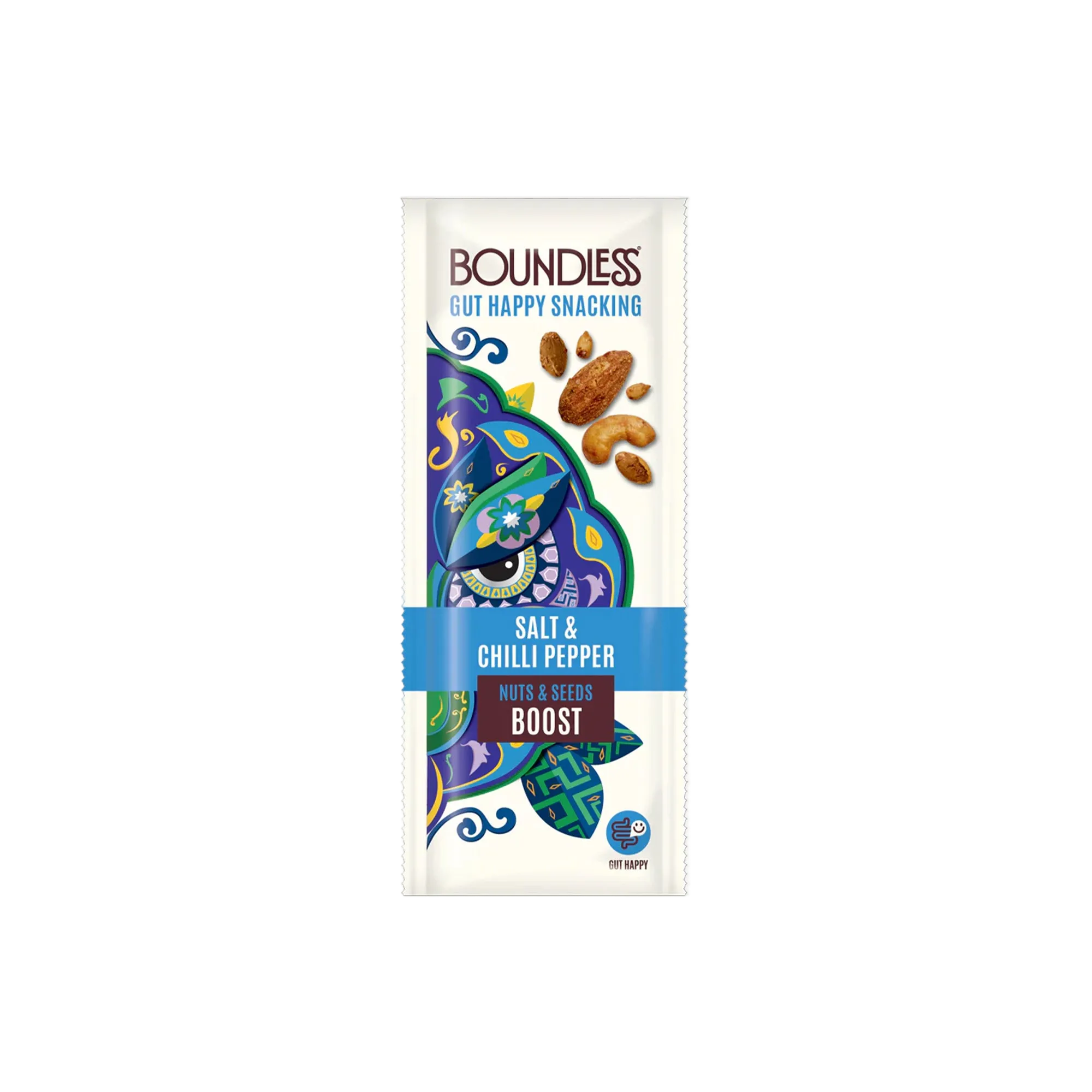 Made with non-GMO and 100% natural ingredients, these delicious snacks are a mix of almonds, cashews, pumpkin seeds and sunflower seeds spiced with classic salt and chilli pepper. Salt & Chilli Pepper Nuts & Seeds boast plant-based protein, gut friendly fibre, and are vegan friendly and gluten-free.