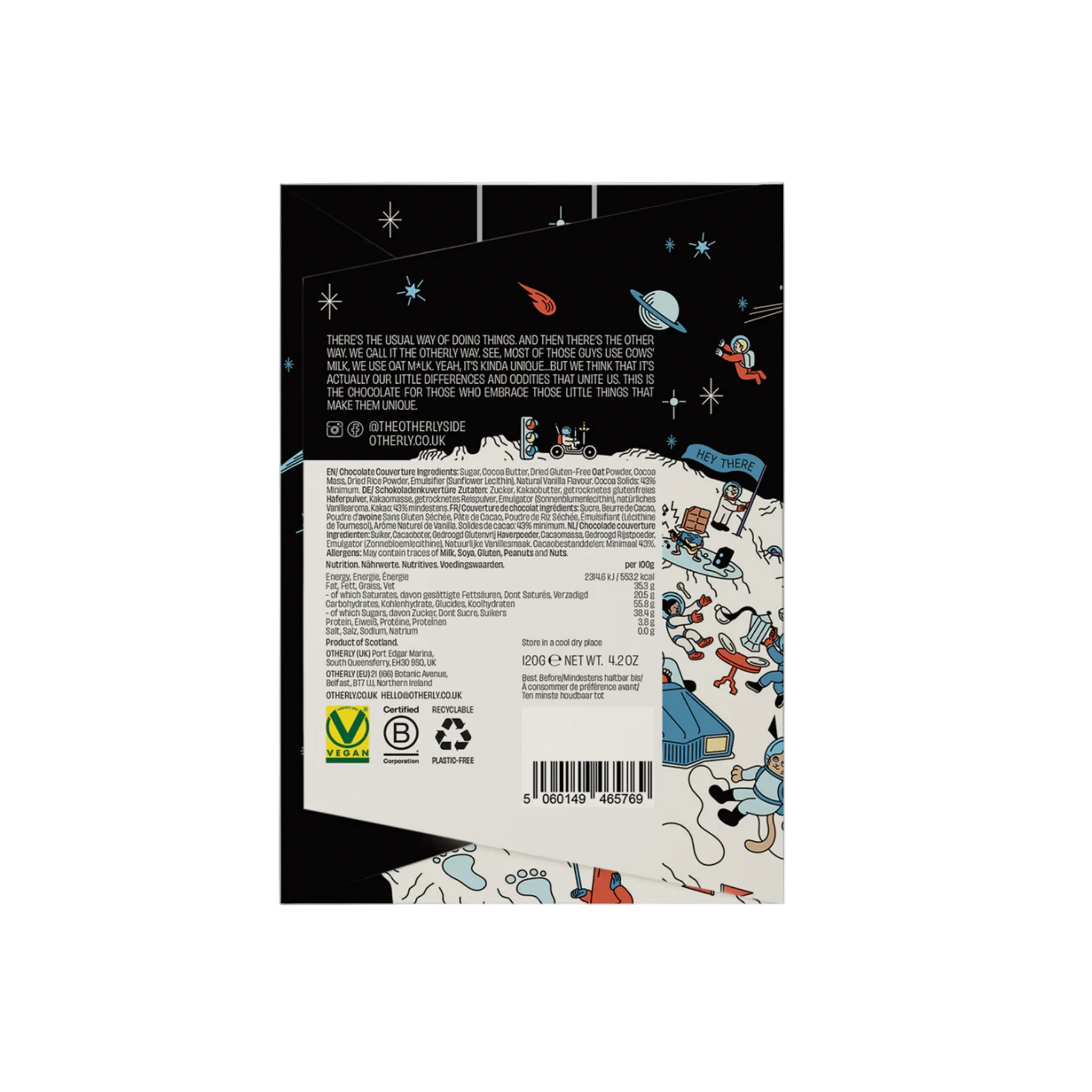 Experience the indulgent, creamy and one-of-a-kind taste of OTHERLY Plain Oatm*lk Chocolate Bar. Made with 43% cacao content sourced from the finest cocoa beans in Colombia and blended with oat powder. This vegan chocolate boasts exceptional roasted cacao notes and a distinctive sweetness that enhances the delicate and authentic biscuity and cereal flavours of oats.