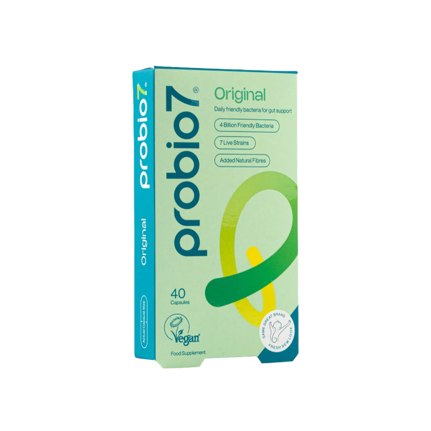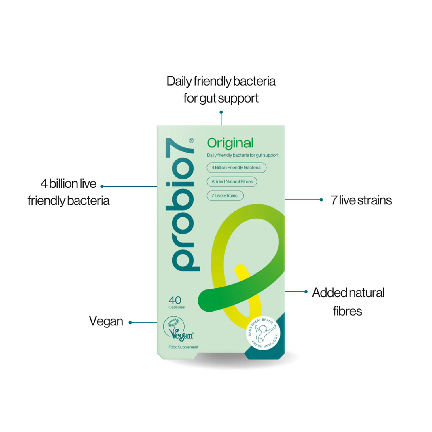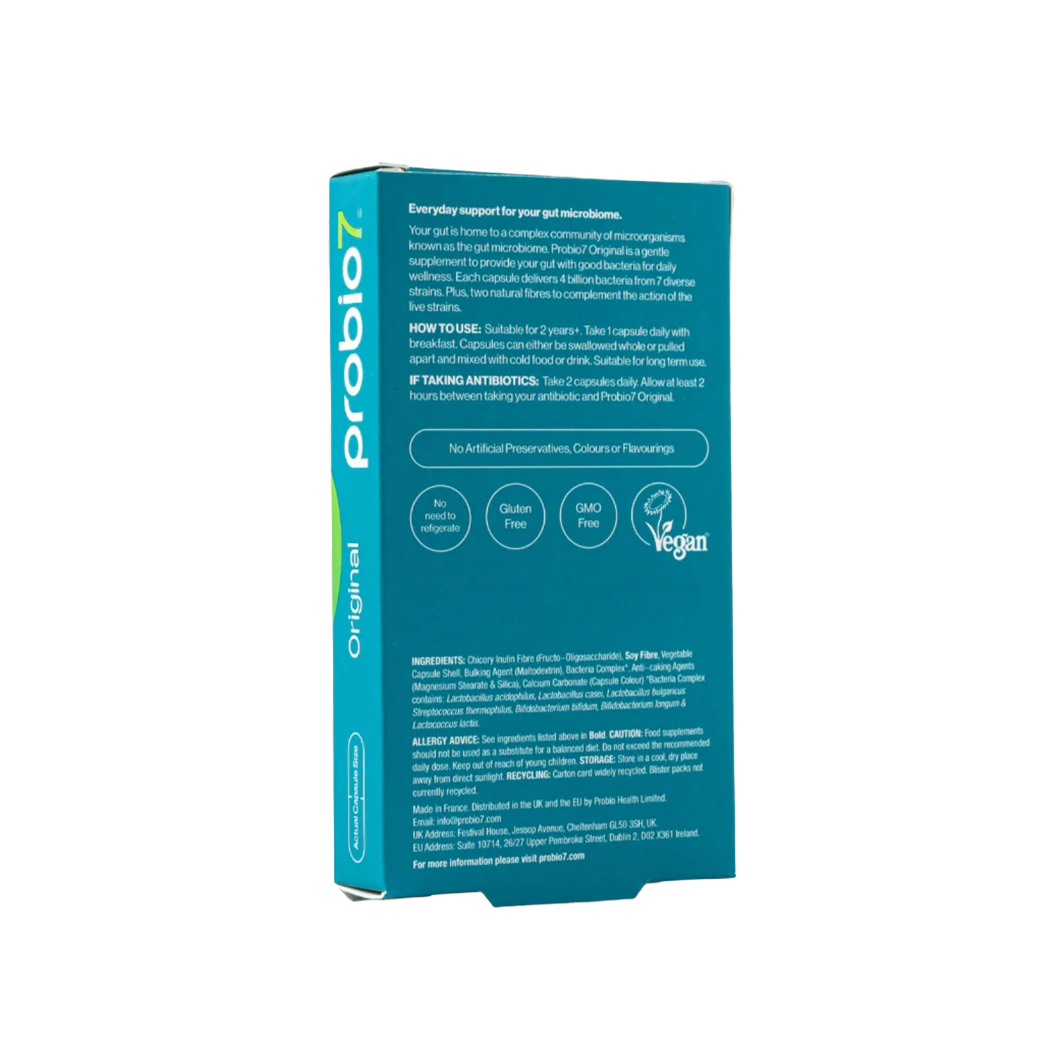 Probio7 Original has been a staple of the Probio7 product line for over 20 years, with countless positive feedback and reviews from satisfied customers. It contains 4 billion live bacteria from 7 well-researched strains, as well as natural fibre that serves as nourishment for the friendly bacteria in your gut, promoting their growth and vitality. These convenient probiotic capsules don't require refrigeration and are gluten-free, vegan, and free of artificial flavours and preservatives.
