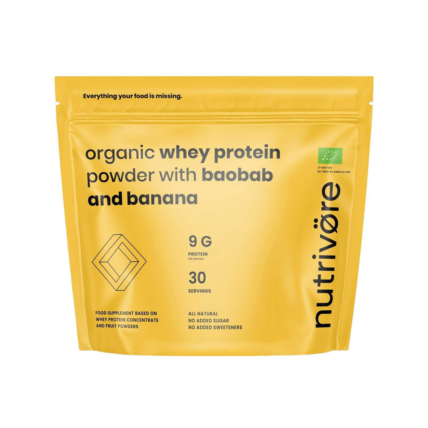 A creamy, 100% organic blend of whey protein concentrate, banana, baobab, and agave inulin – rich in complete protein, prebiotic fiber, and natural vitamin C.