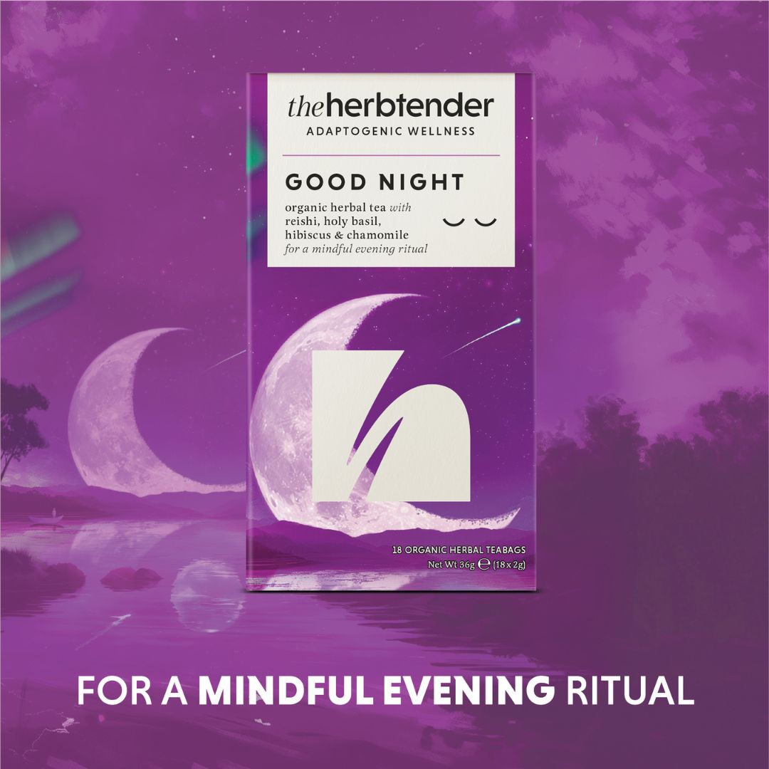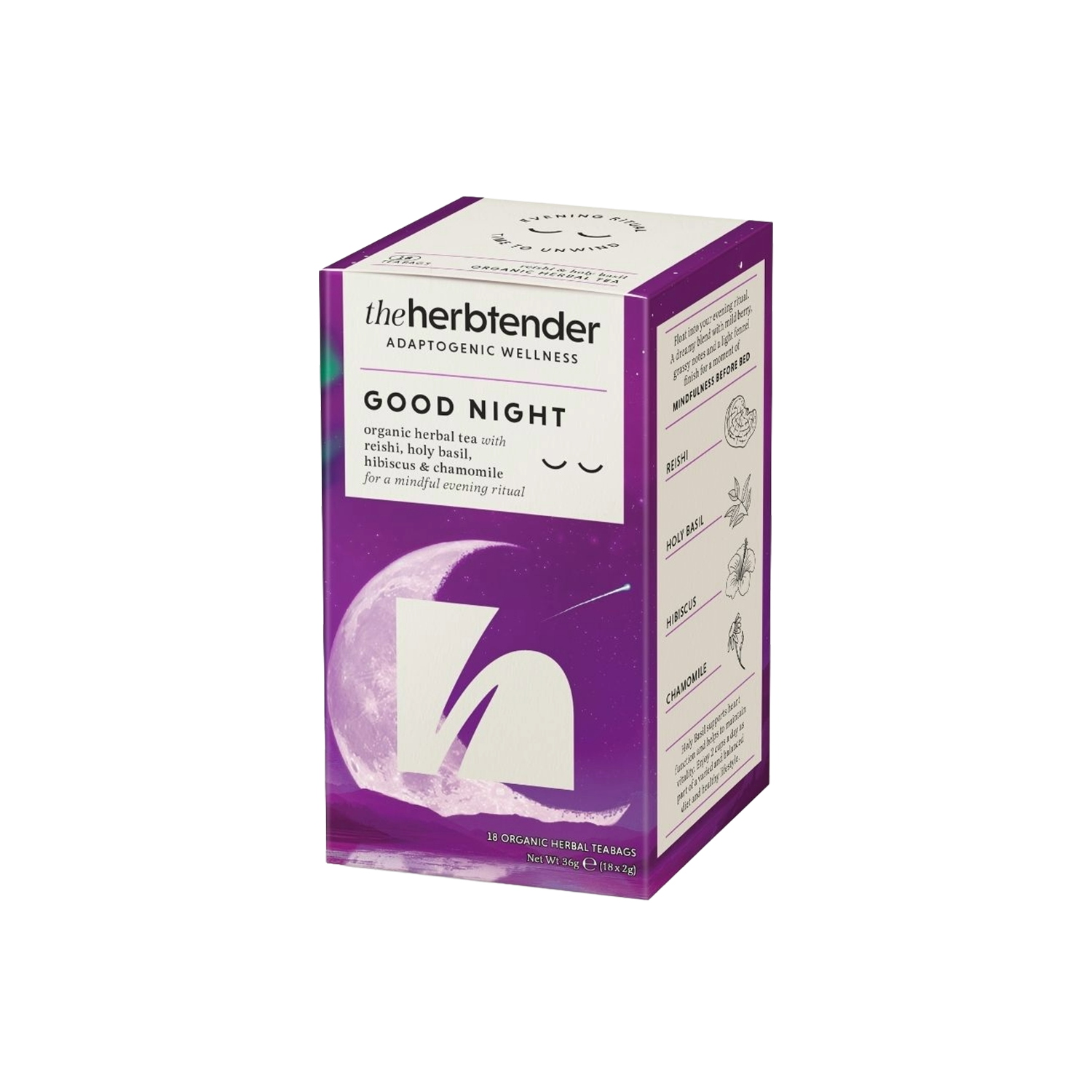 A gently calming tea, Good Night will help you prepare for bed. Make it part of your night time ritual. This blend opens with the soft notes of chamomile, smooth and mellow on the palate. Hibiscus brings a gentle tartness that lifts the profile with a crisp, slightly tangy edge, balancing the floral base. Holy Basil adds herbaceous warmth and faint spice, grounding the blend with a hint of depth. Reishi rounds it out with an earthy, almost woody undertone that lingers softly, bringing a sense of quiet balance.The overall infusion is calming and full-bodied, with a layered softness that gently settles the senses and signals the close of day.
